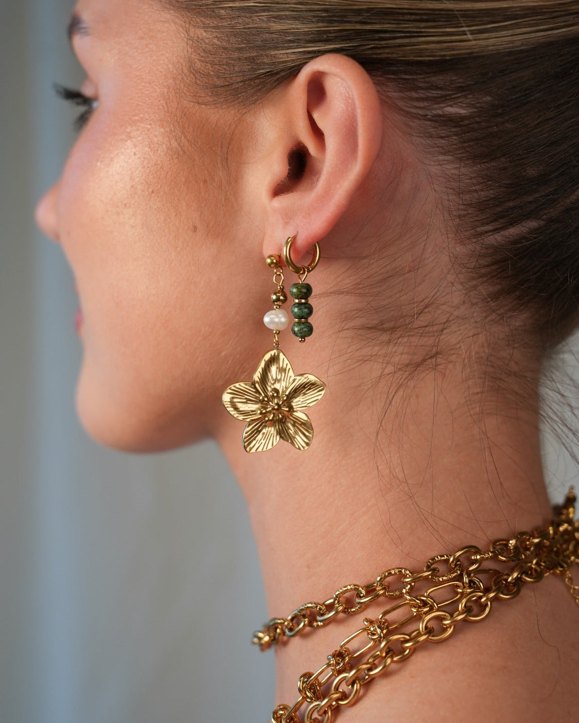 Statement earrings are earrings that immediately stand out due to their shape, size, or color, setting them apart from more subtle jewelry. Think of large earrings, unique shapes, or bold designs that give your outfit extra character and instantly catch the eye.