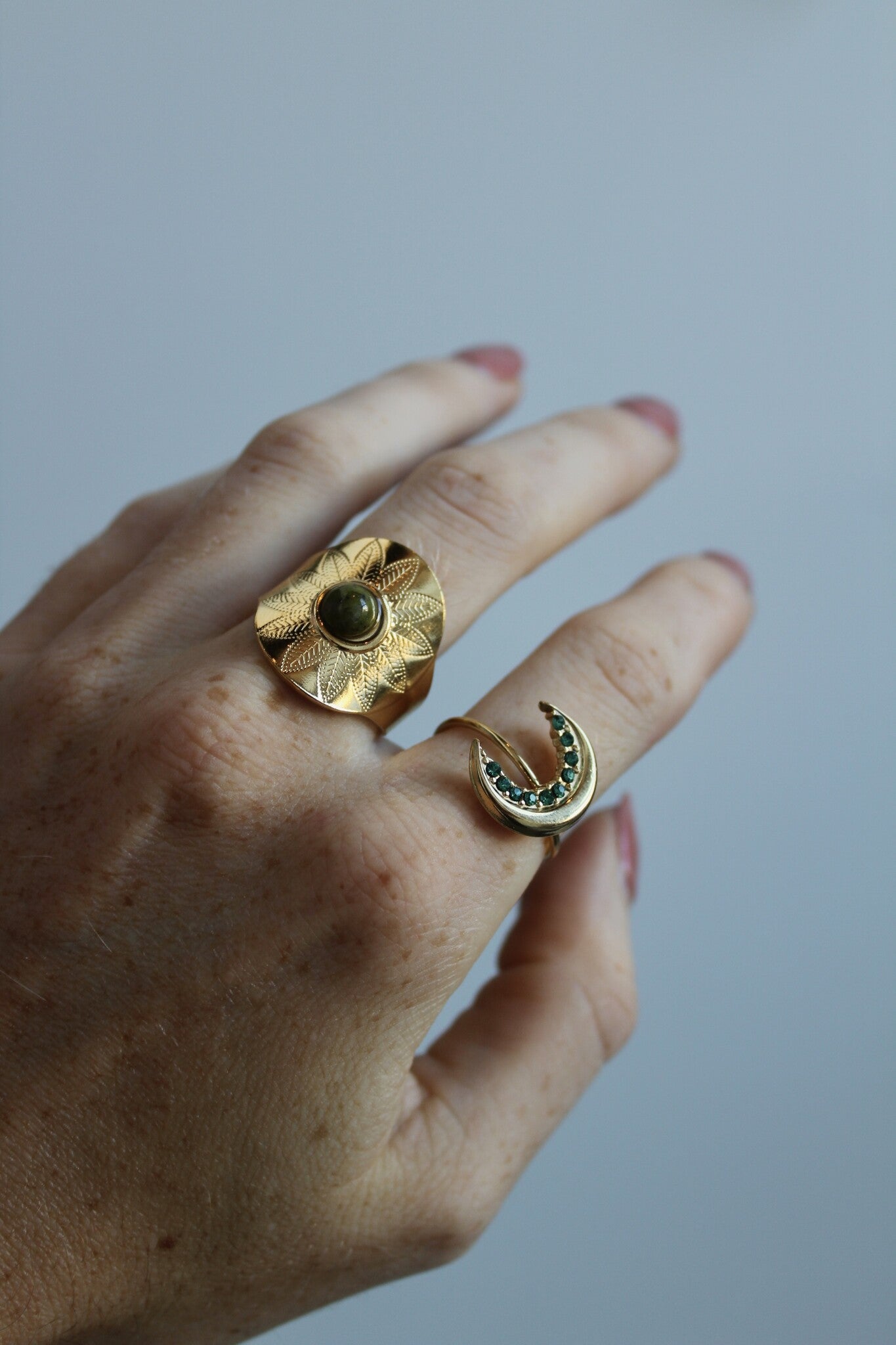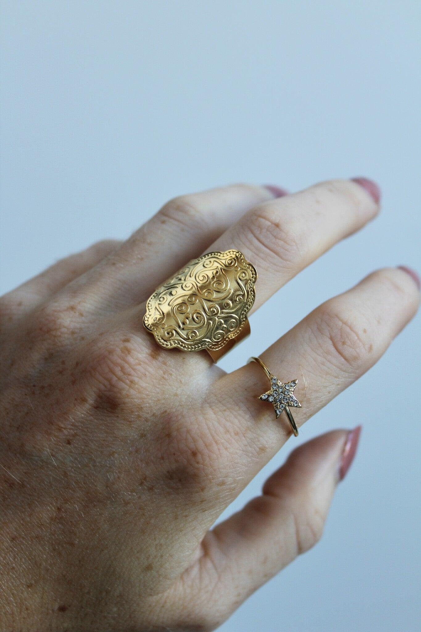 Statement rings are true eye-catchers in your jewelry collection. With their bold designs, they instantly draw attention and add a powerful touch to any outfit. Wear them solo for a bold look or combine them with other rings for a unique, personal style. Perfect for adding extra character to your look, whatever the occasion.