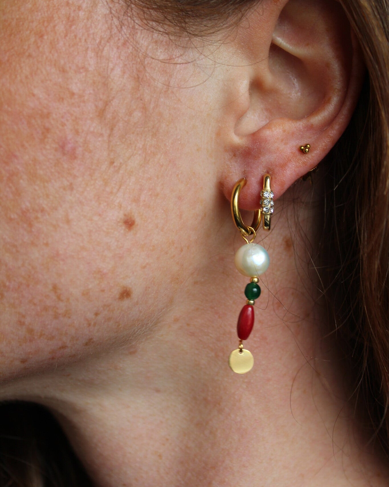 hartjes studs in een oor met heel veel kleine immitatieparels